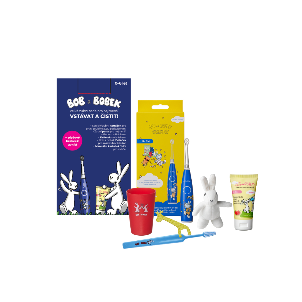 Bob a Bobek darčeková sada – Veľká zubná sada pre najmenších s modrou sonickou kefkou a USB nabíjaním
