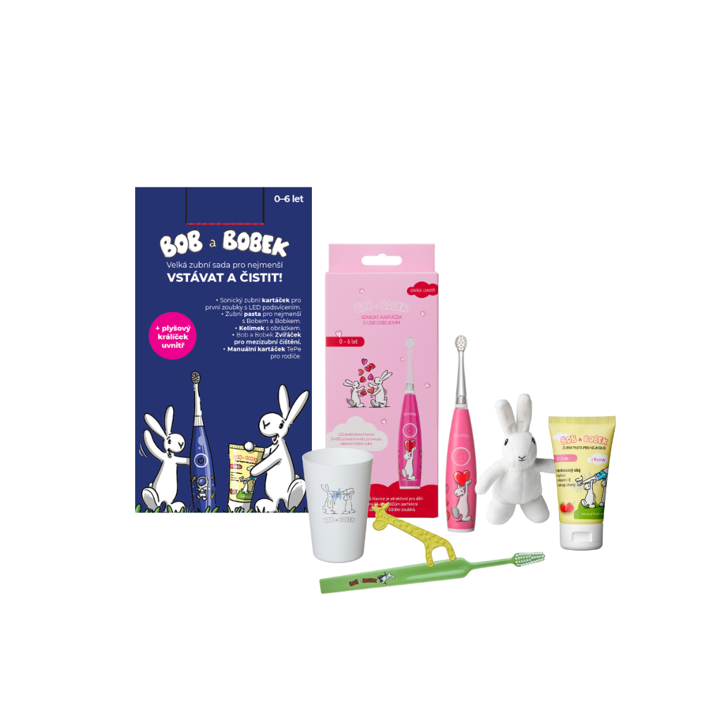 Bob a Bobek darčeková sada – Veľká zubná sada pre najmenších s červenou sonickou kefkou a USB nabíjaním