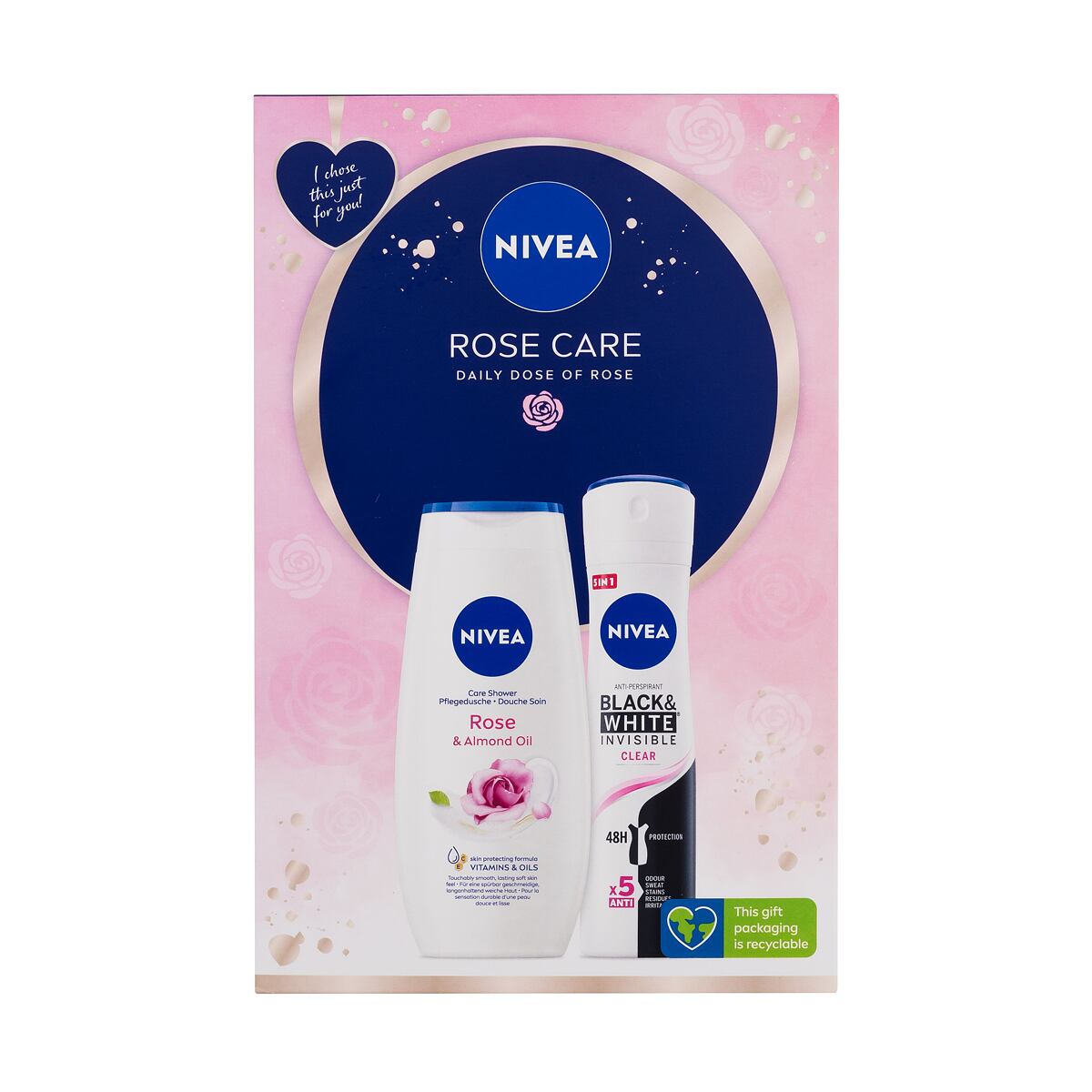 Nivea Rose Care sprchový gel rose & almond oil 250 ml + antiperspirant black & white invisible clear 150 ml pre ženy