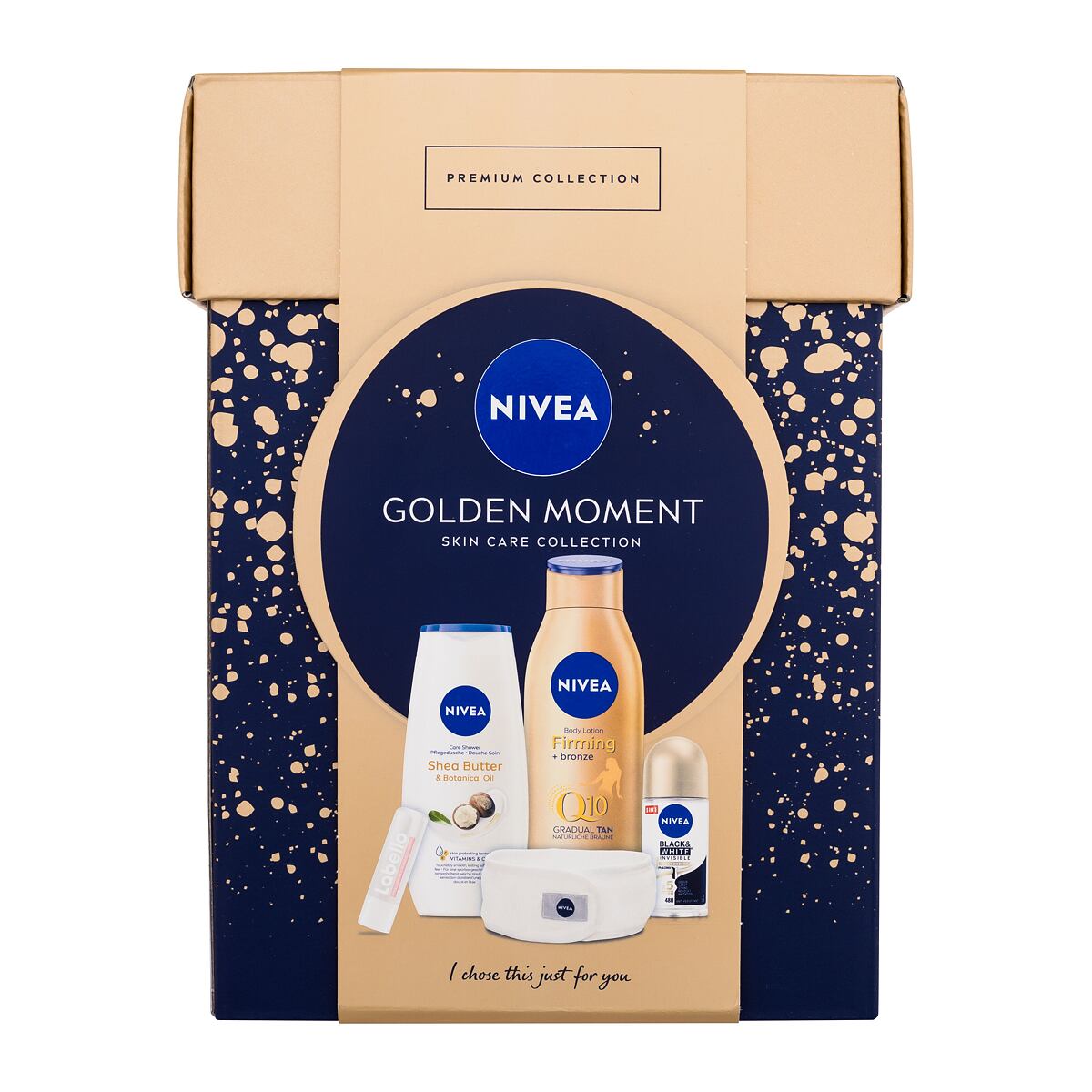 Nivea Golden Moment tělové mléko q10 firming bronze 400 ml + sprchový gel shea butter & botanical oil 250 ml + antiperspirant roll-on black & white invisible silky smooth 50 ml +…